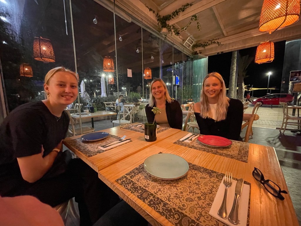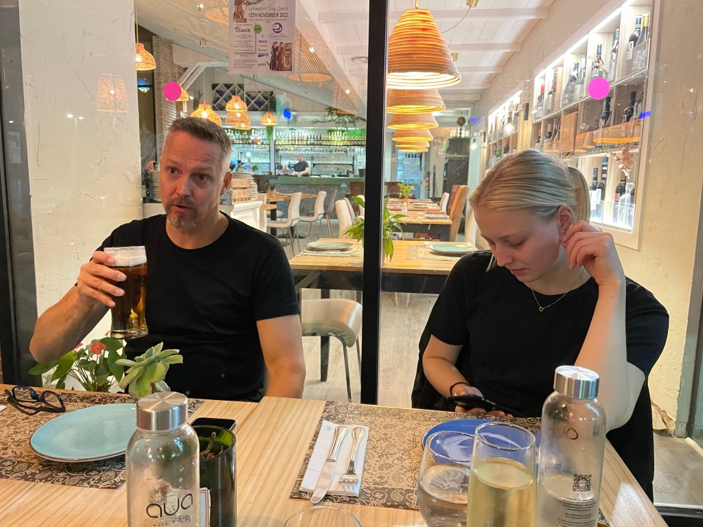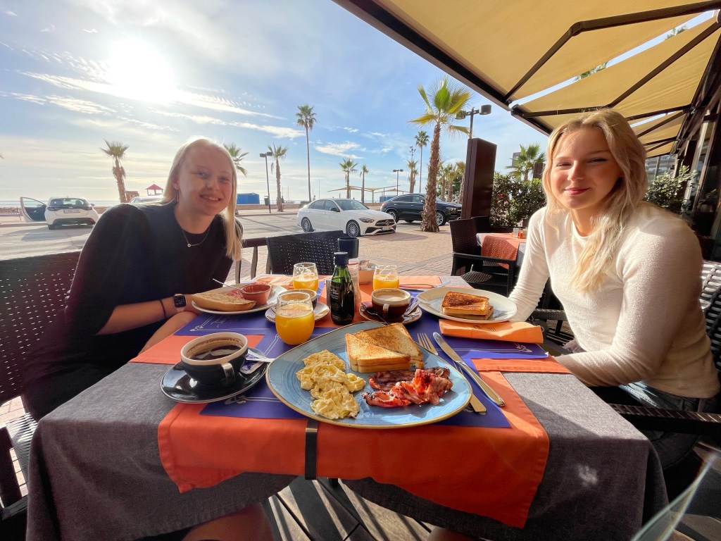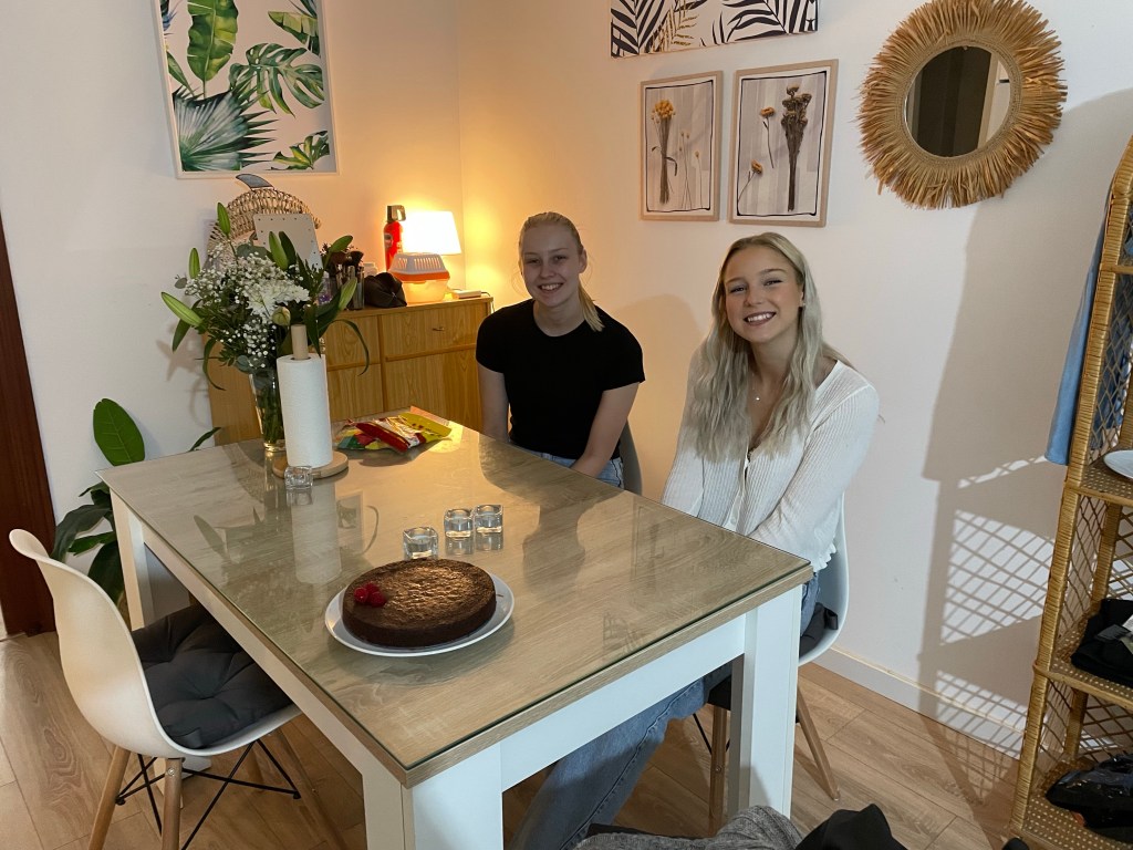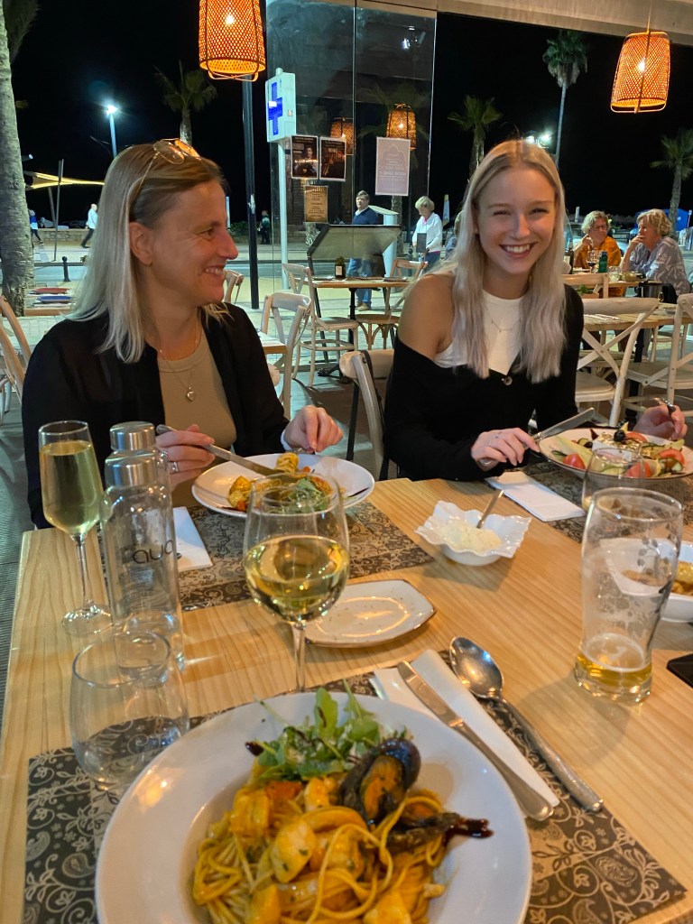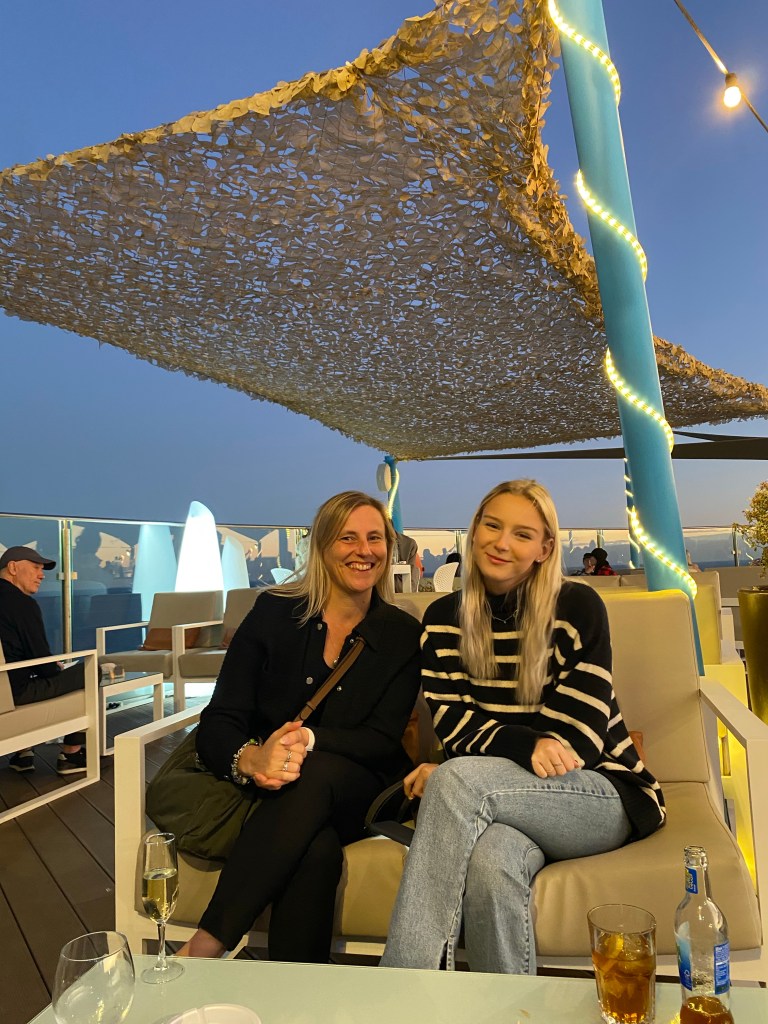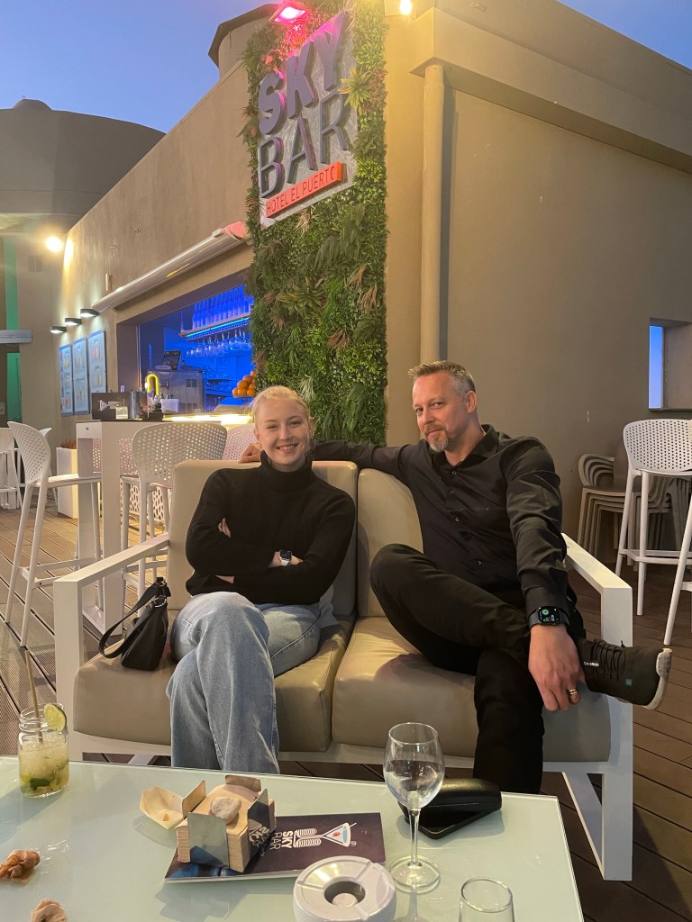 ❤️Bästa gulliga tjejerna hade fixat fin frukost på sängen❤️Och blommor..…och paket också🥰Glad mamma🙏😊Efter frukosten var Lina tvungen att göra sig iordning och gå till skolan……men Tove följde med på en promenad innan det var dax för henne att koppla upp sig och plugga.Då passade Magnus och jag på att kolla in om takbarer fortfarande hade öppet.Och det hade den. Det var så mysigt där uppe så vi satte oss där en stund Kolla vilken proffsbild Magnus tog på sin Sangria 😊Och fiskmåsarna surfande på andra sidan glasväggen!Lite senare började vi kvällen på samma ställeSista kvällen på stan för den här gången.Stilbild på pappa Och så passade Tove på att ha en liten foto shoot med Lina i solnedgången Väldigt fint där uppe!Men det kändes ändå lite udda med en pool där. Det var ändå någon enstaka som badade🫣Sen hittade Tove en jättebra restaurang som låg mitt på ”turisttorget” som vi gick till.Casa Colón hette det. Dom hade allt möjligt gott på menyn. Bra blandning för oss som är två köttälskare och Två ”allt annat”-älskare🥰Vilken bästa bästa-dag för en som älskar födelsedagar💕Sen vandrade vi hem längs stranden mätta och belåtna 🙏Fredag och dax att packa för hemfärd🙁 Men vilken vecka vi har haft! Innan vi åkte bakade Tove en kladdkaka.Men vi hann aldrig vänta tills den hade svalnat så den fick vi lämna kvar till Lina 🙄Ombord på planet och smygfotade av en glad Magnus men……behind the scenes…😅Tack och hej från en tjej som tydligen aldrig kommer bli stor🤷♀️😁