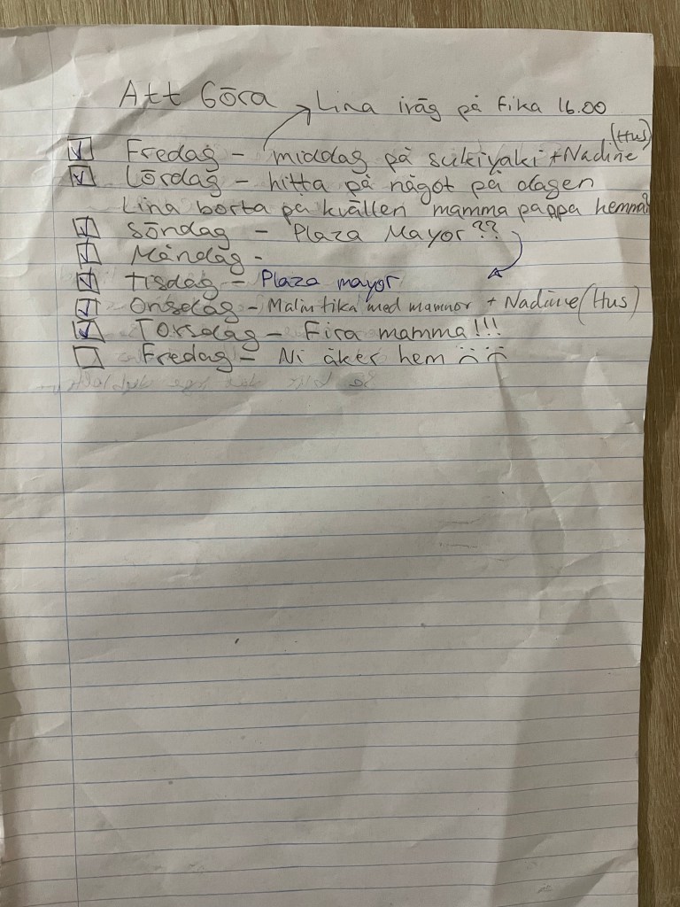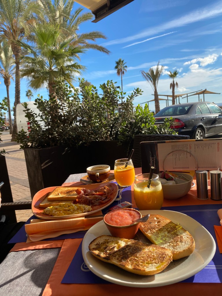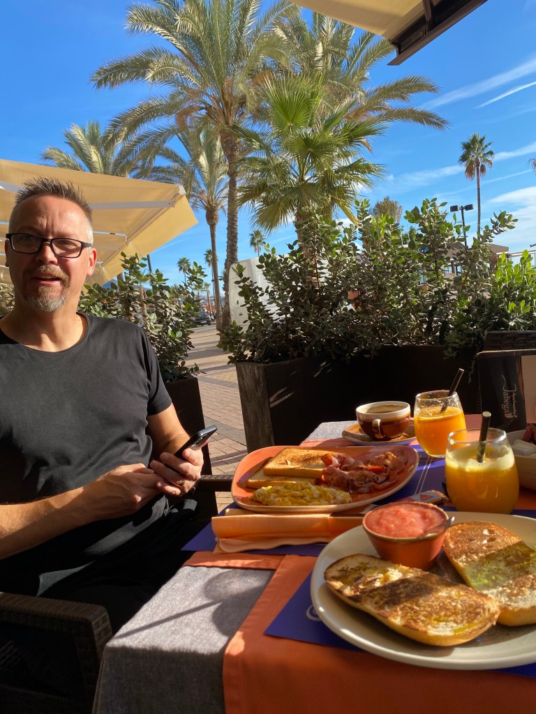 Mot Arlanda 👉Fika med lunchmacka innan avfärdTove i kön till påstigning……Magnus var först i kön😆Framme hos Lina i Fuengirola🥰Vi lämnade bara in väskorna i lägenheten och sen gick vi iväg för att äta middag.Kortärmat i November, crazy nice😌Så skönt att vara här ❤️Första morgonen vaknade jag med migrän🙄 Så medan jag kurerade mig så passade Magnus och Tove på att äta en frukost i solen❤️Vilken härlig start på dagen!Obligatorisk bild på maten 😁Det såg riktigt gott ut och enligt frukostgänget så var det en hit!Till och med så bra att det blev en till på onsdagen när Lina började skolan lite senare… jag var dock inte med den gången heller för jag passade på att onsdagsfika med tjejgänget/mammagruppen när jag nu äntligen var på plats!