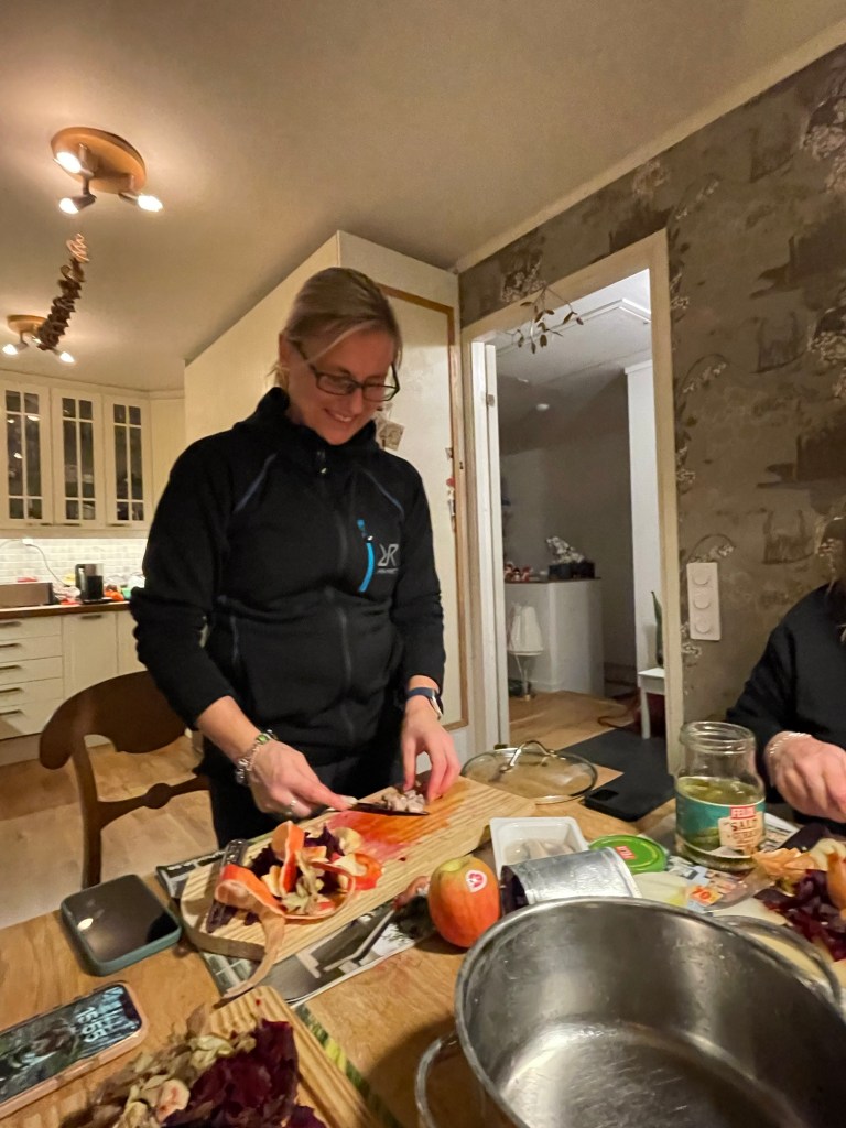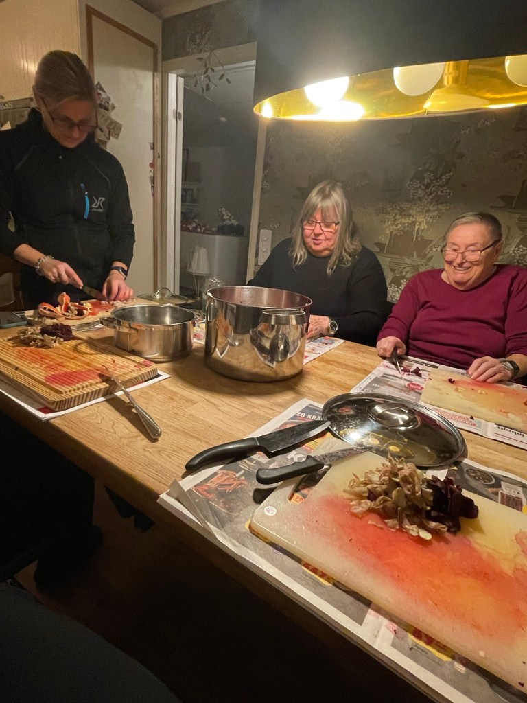 Nina påminde mig om att förra året fick hon skära sillsallad ensam för att jag hade smitit ifrån julstöket och dragit till Lina i Spanien 🥰 Men nu är allt återställt, Lina är hemma och jag med och därmed blev det träff hemma hos oss för att skära årets sillsallad, traditionsenligt efter mormor Gretas recept!
