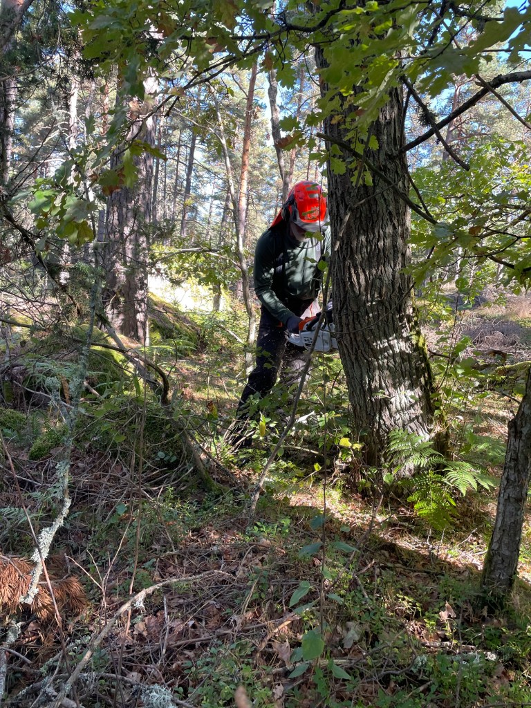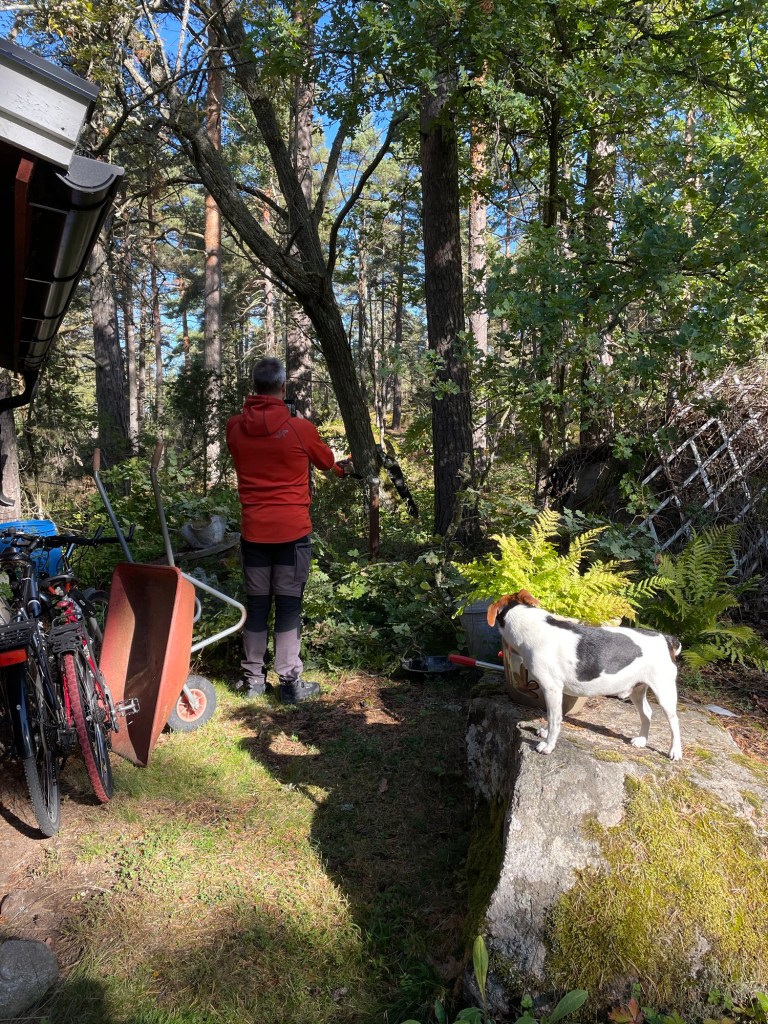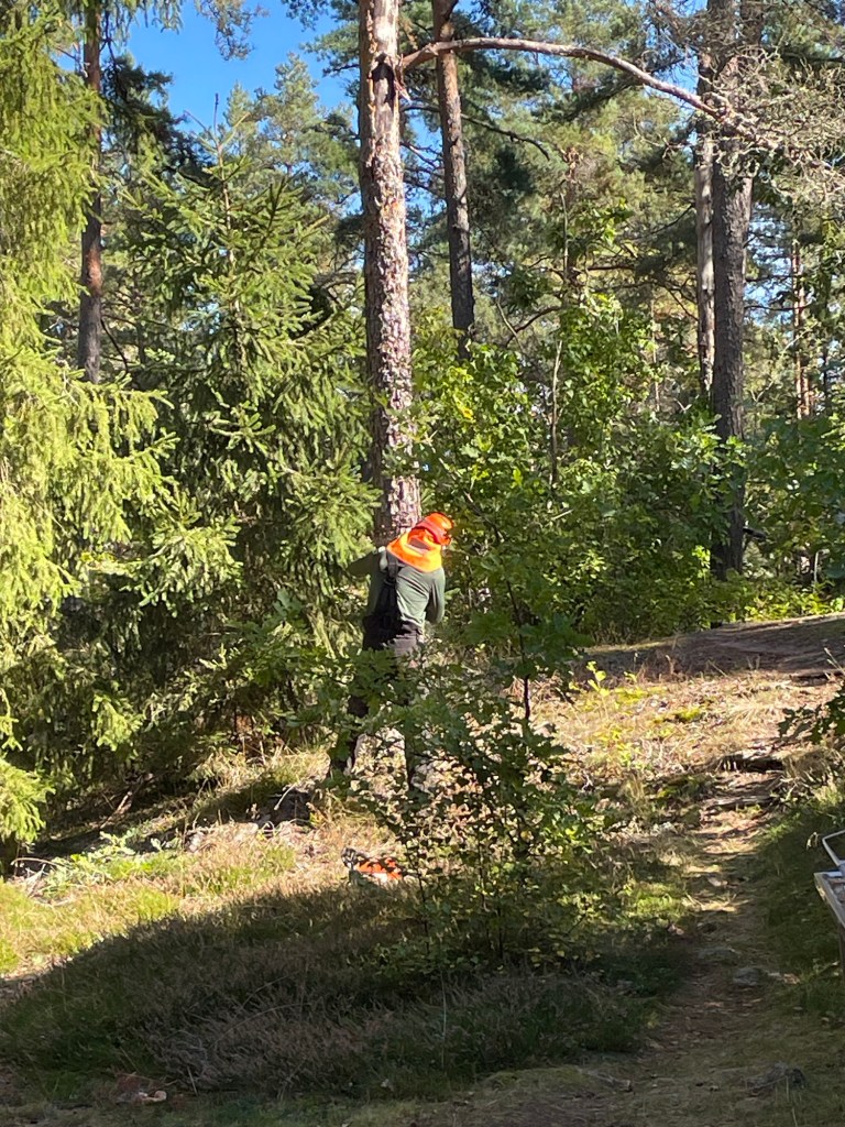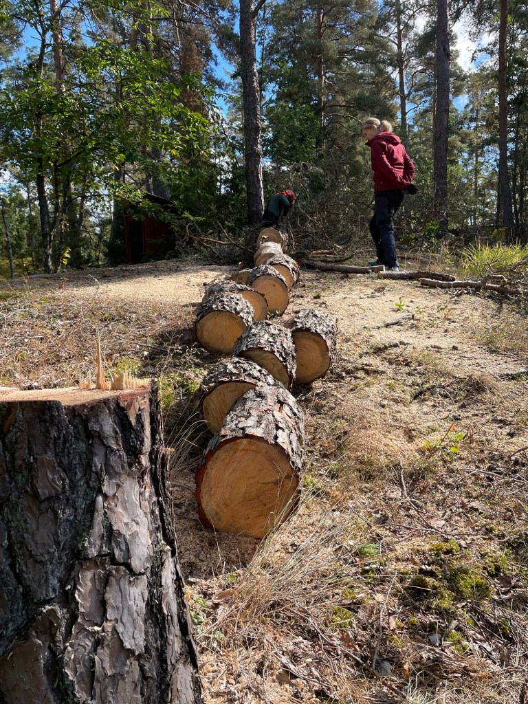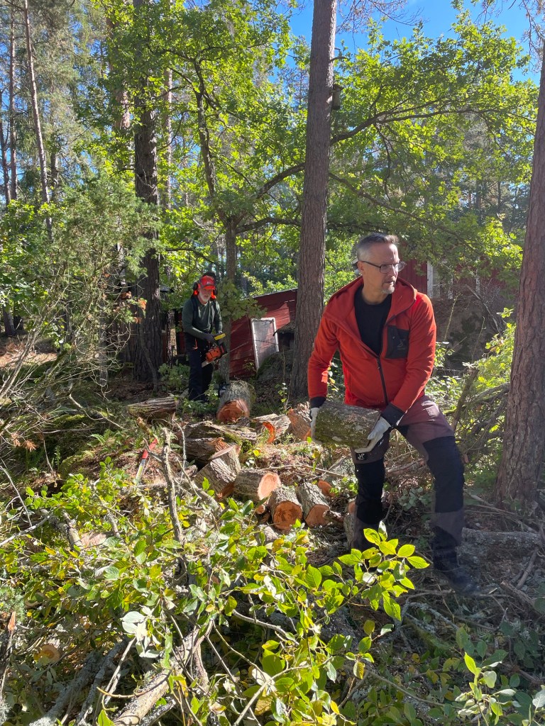 Vi har haft några träd som har dött och nu lutar lite oroväckande mot husen på landet. I helgen fick vi hjälp av familjen Holm med Peter i spetsen, han har ju gått och utbildat sig till trädfällare👍