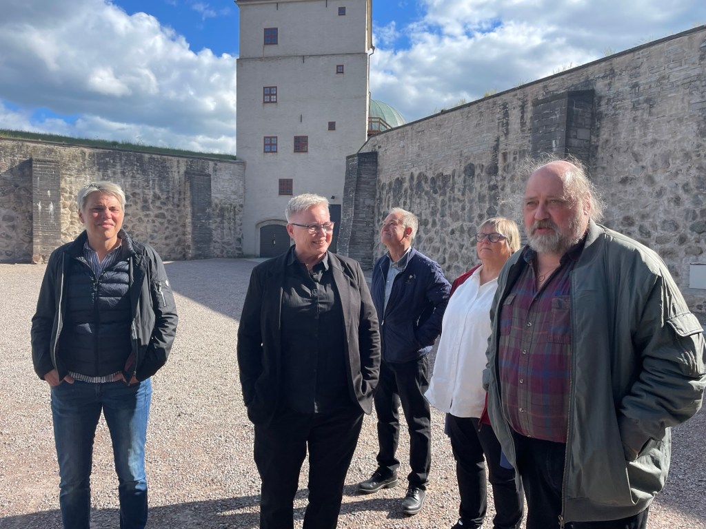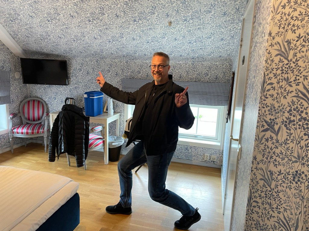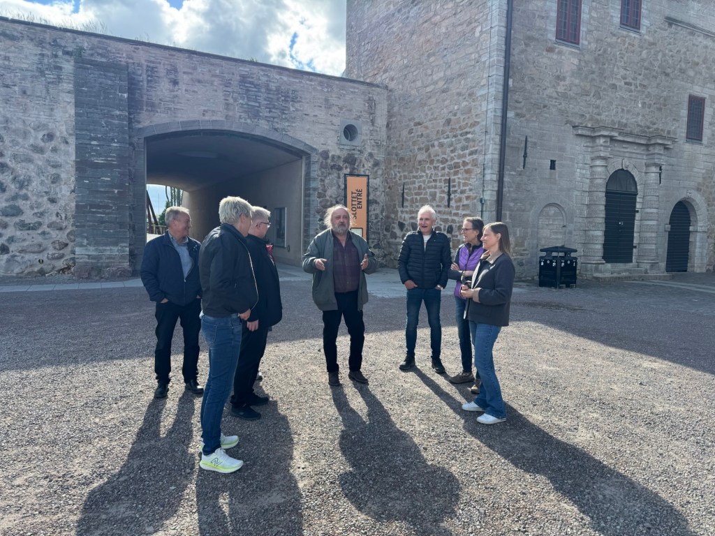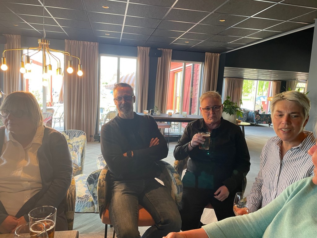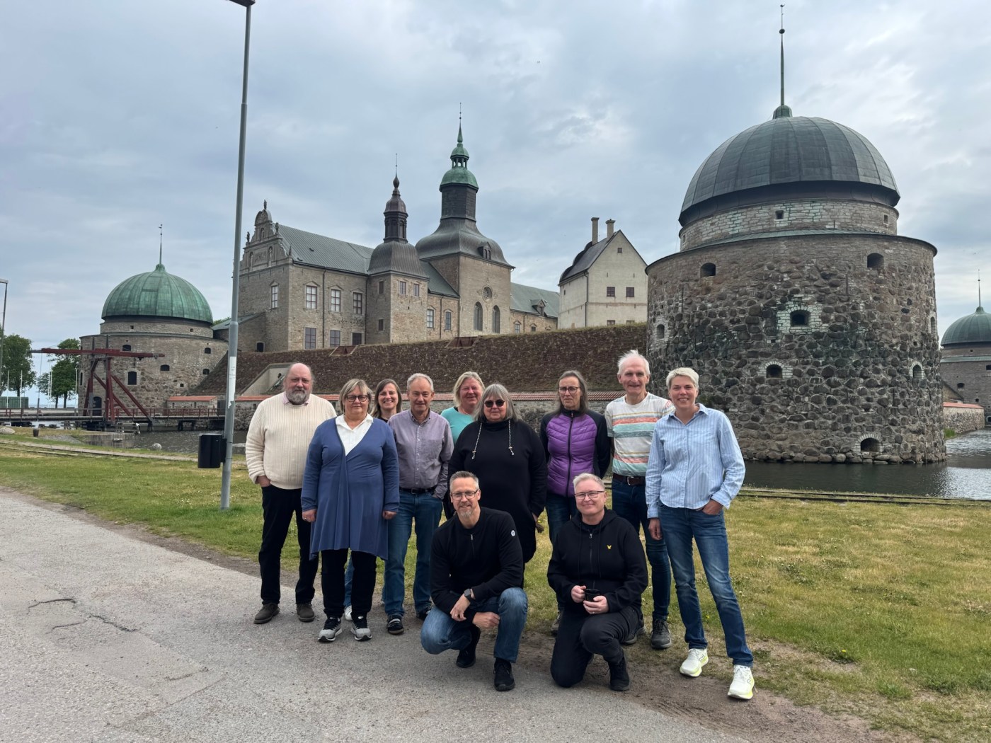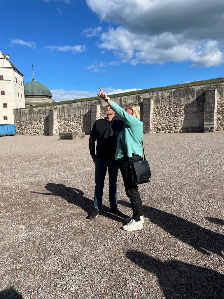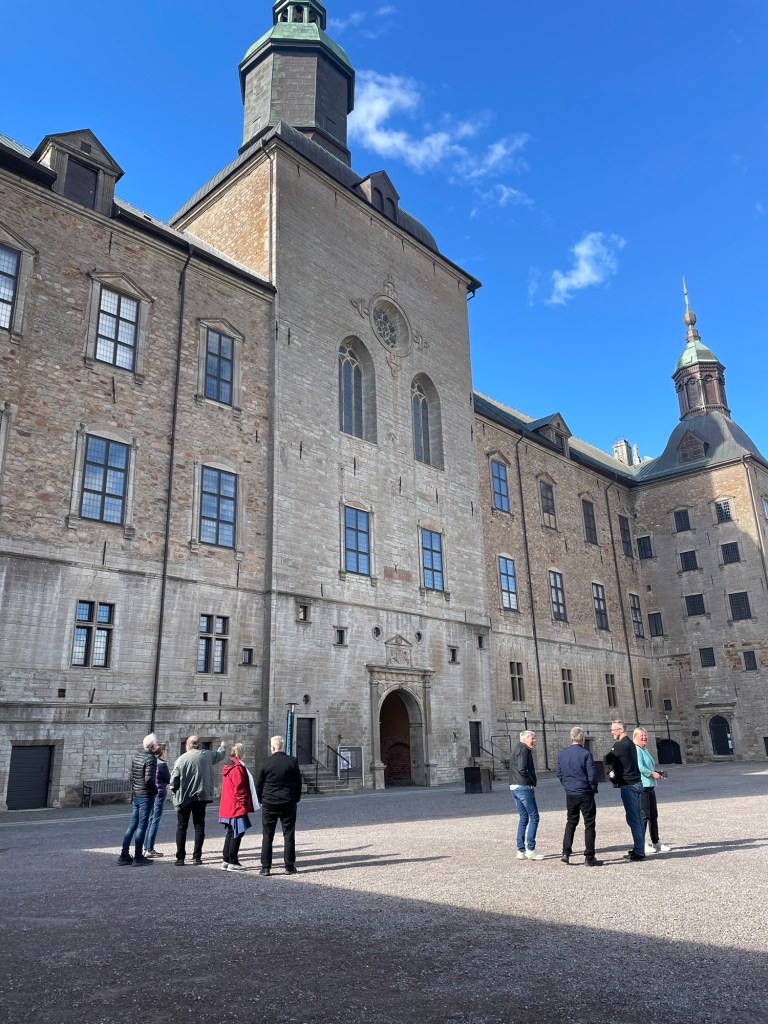Vårt rum på övervåningen där vår skara hade hela planet för oss själva.👍😁Nina och vi kom först, eller Nina hade kommit först om inte vi hade kört om henne på vägen😁 Så efter incheckning satte vi oss i lounchen och väntade in de andra.Så småningom ramlade de in en efter en Peter, Annika och Olle…Kenneth på vänsterkantenSusi, Magnus, Carina, Madde och lite av Agneta😊Hela gänget (utom jag som var fotograf 🙂).Efter att alla hade checkat in gick vi ut på en liten sightseeing med vår egen historiker, arkeolog och bror Olle.Över bron och……in på slottet.Eller Vadstena slottsgård, slottet var stängt.Olle håller lite historielektion.