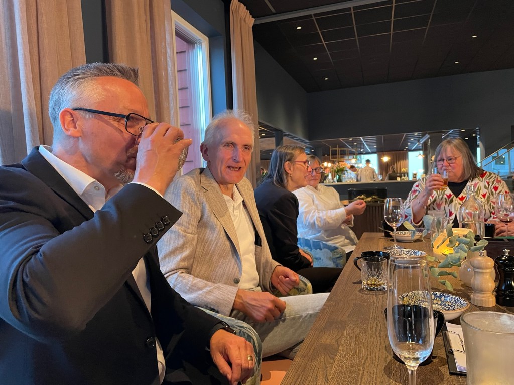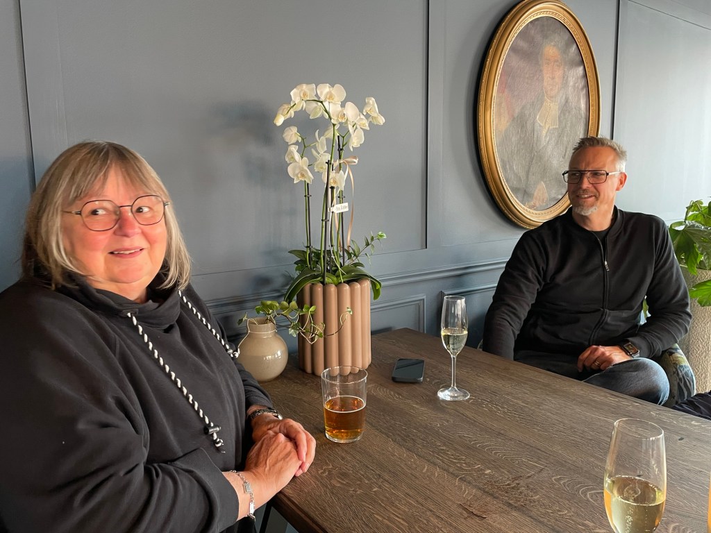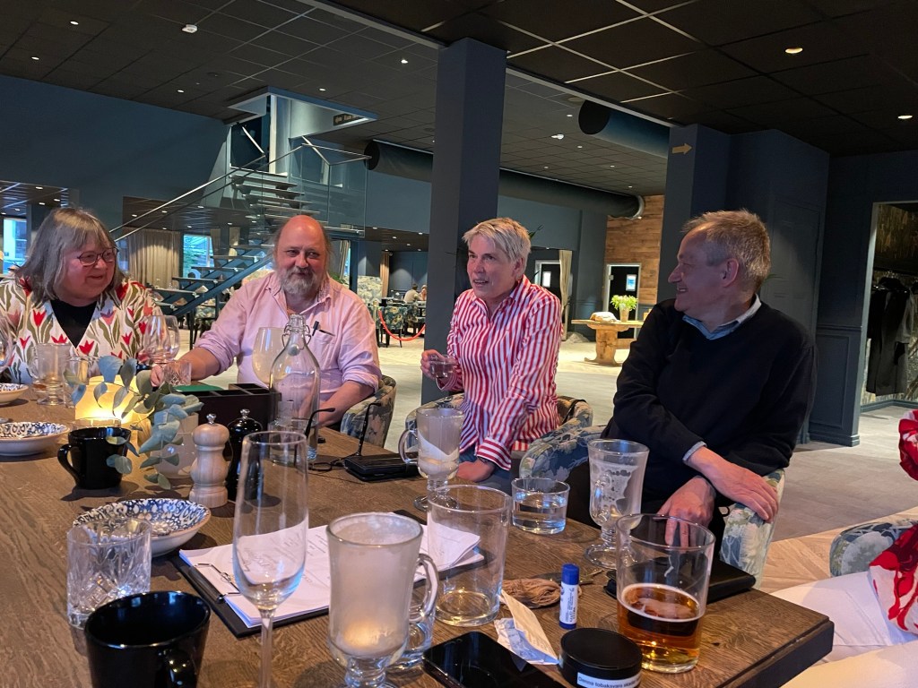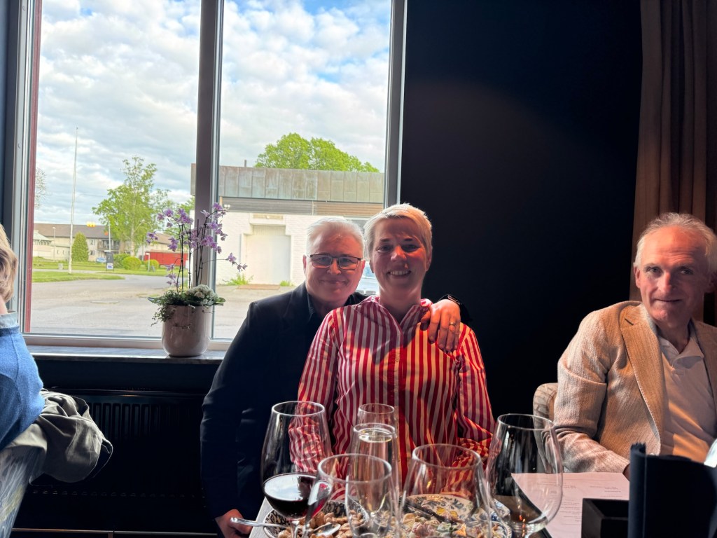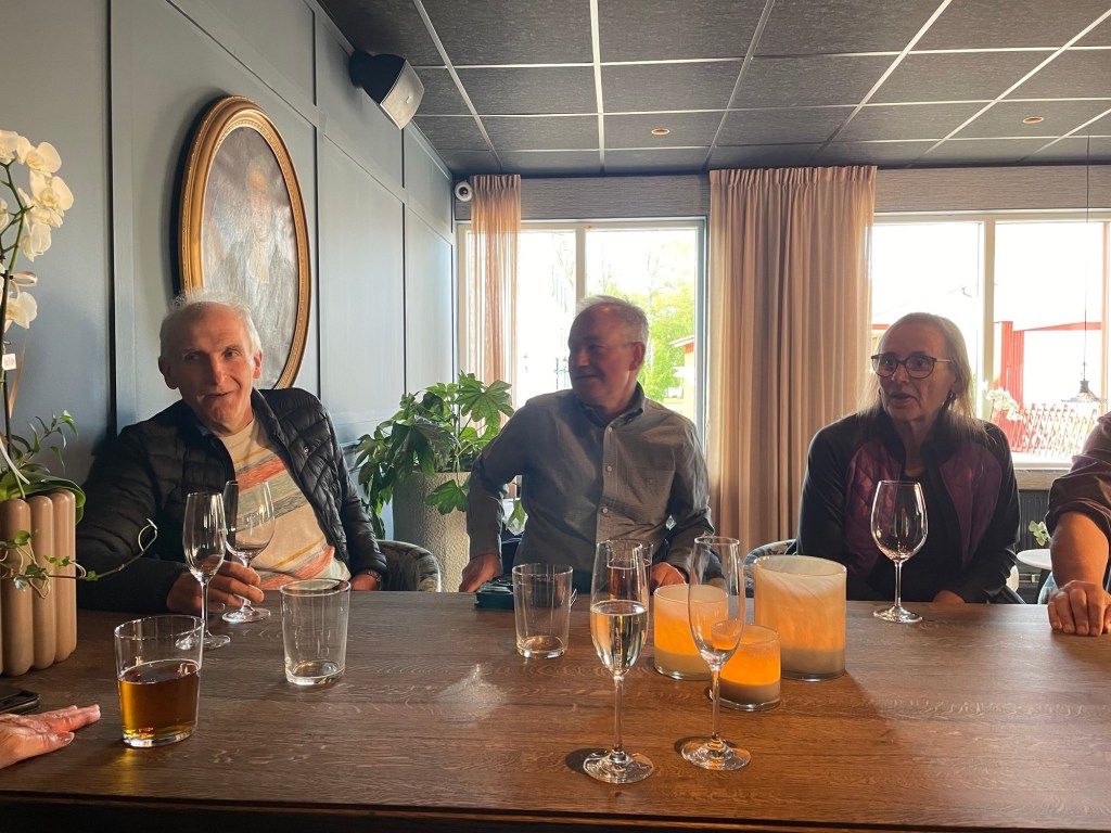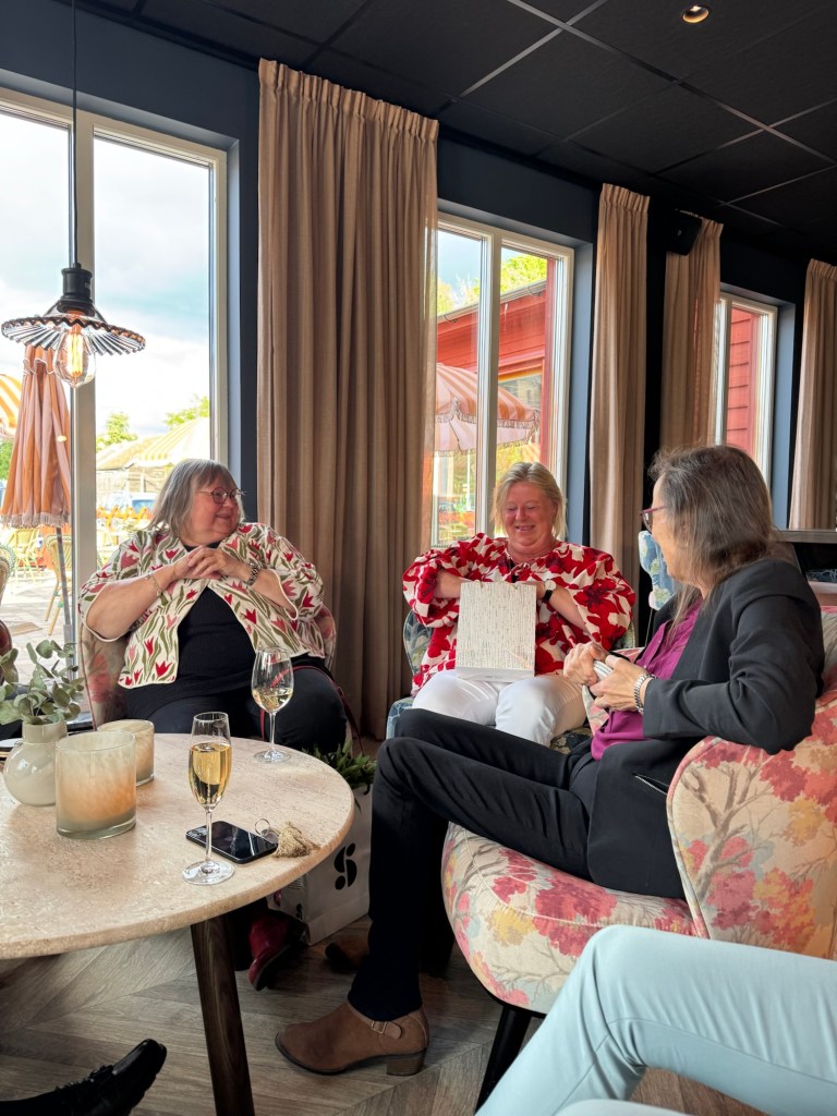 Historien om VadstenabullretEfter slottet gick vi också upp till torget och fick höra om en man som gömt sig hos nunnorna men som de hämtade ut i alla fall, vem var det nu igen🤔Efter promenad gjorde vi oss klara för middag och slog oss ner och väntade i lounchen.Agneta fick en liten present i efterskott eftersom hon smet utomlands förra året när hon fyllde jämt.Carina o Madde på middagen.