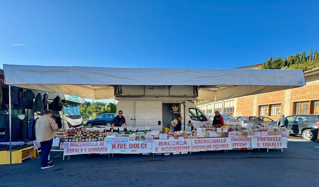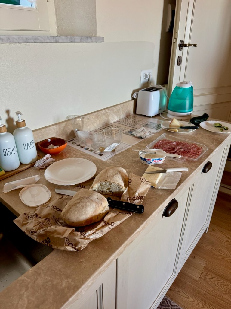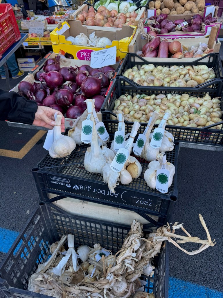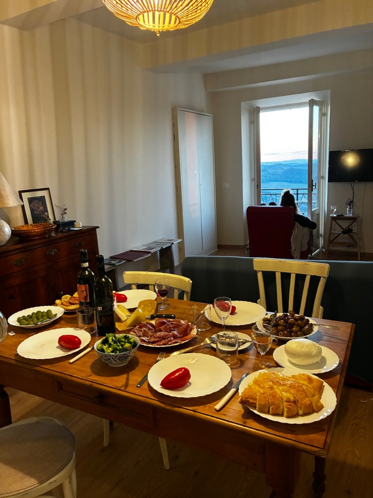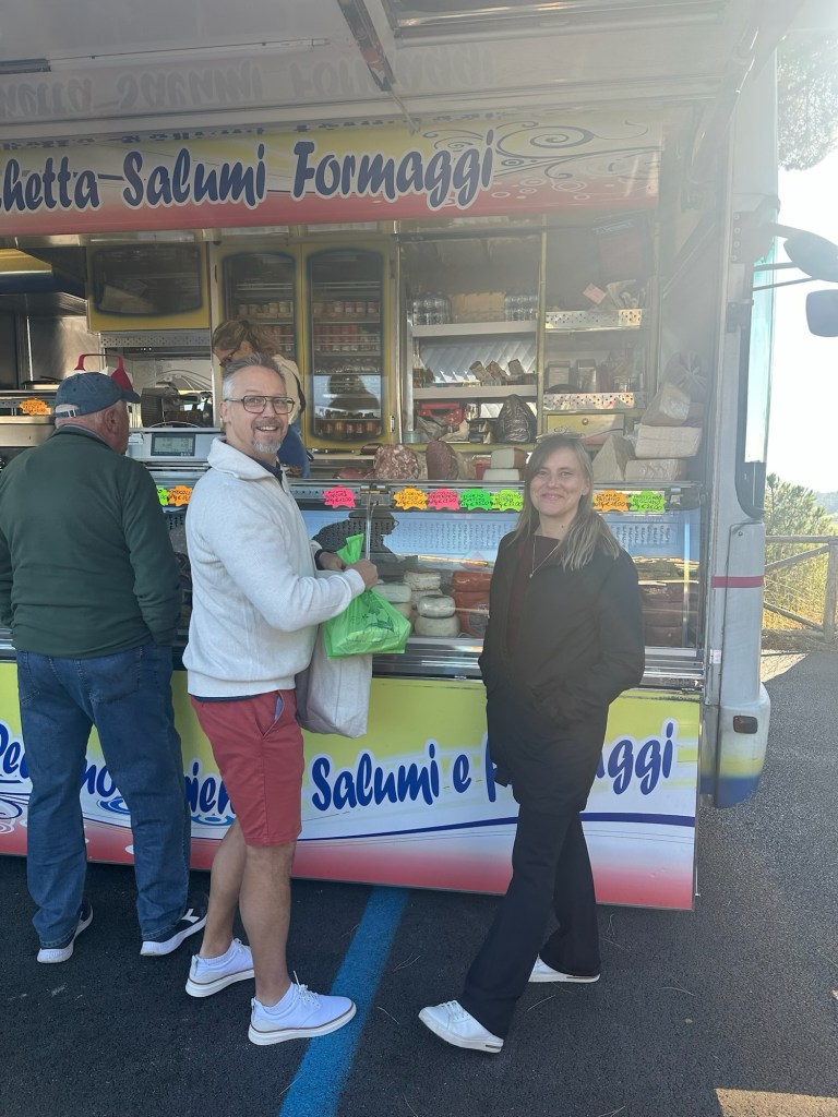 Alltså titta på det här!!🫶Här är en bild åt andra hållet, vardagsrum och kök.När vi hade installerat oss gick vi ut på stan.Promenad i den pittoreska och kraftigt backiga byn😊Här har vi bokat bord för lite plock och ett glas vin.Väldigt gott men…Inte lika gott som den här pastan med vit tryffel och svamp!! Det var lätt bland det godaste jag har ätit i hela mitt liv!!!På morgonen efter var Johan uppe och ute tidigt och köpte frukost till oss 🙏Utanför lägenheten.Efter frukost begav vi oss ner till den lokala marknaden.Här köpte vi på oss en massa gott!Största vitlöken jag sett!Jag bekantade mig med ortsborna, på italienska förstås👍 …eller han frågade om jag pratade Italienska, och jag sa nej, men det gjorde inget, han pratade på ändå😂 Jag måste ändå säga att jag förstod ändå lite med det lilla jag kan🤗Han var väldigt trevlig och verkade vara en person som alla kände i alla fall🫶På eftermiddagen åkte vi på vinprovning i närheten av Montepulciano.Det här var ett riktigt trevligt ställe! Rekommenderas!!
