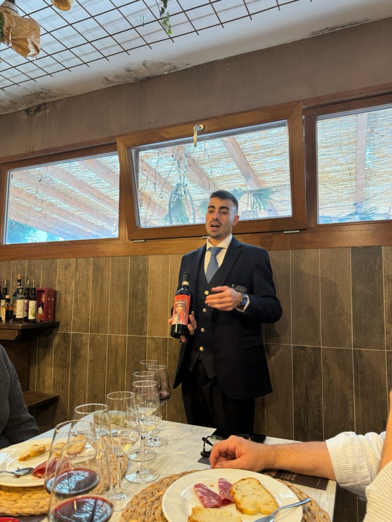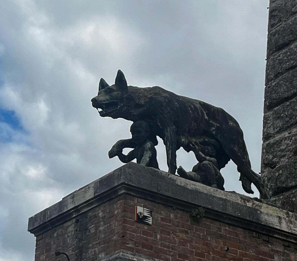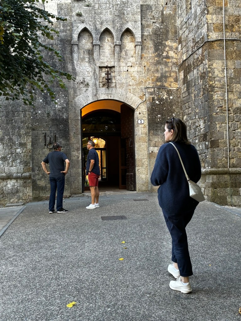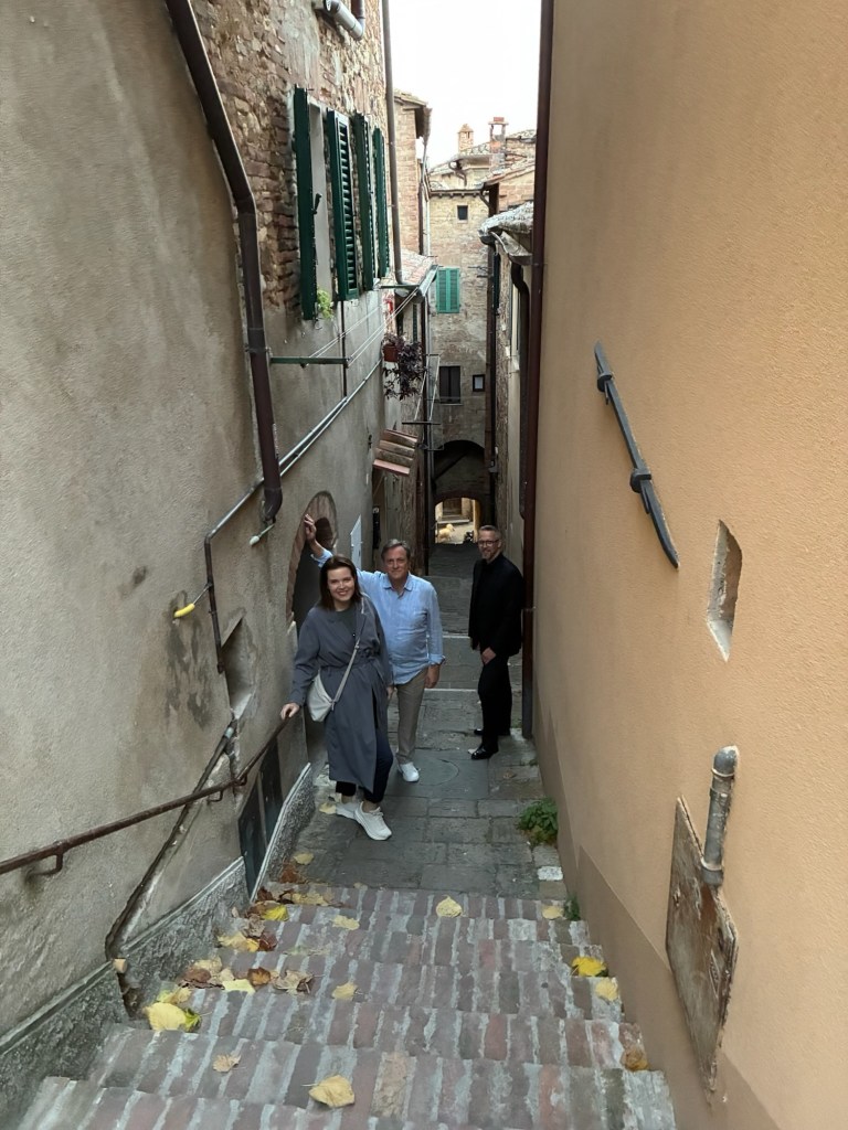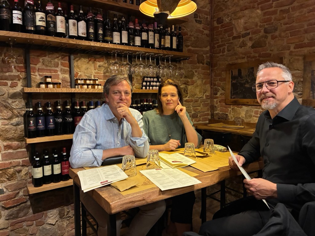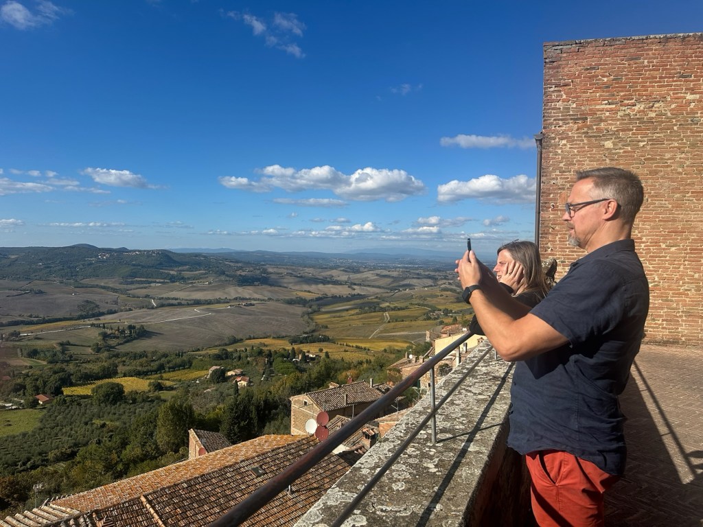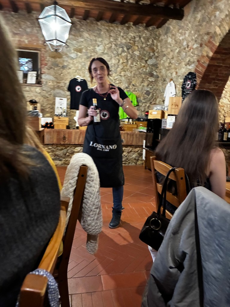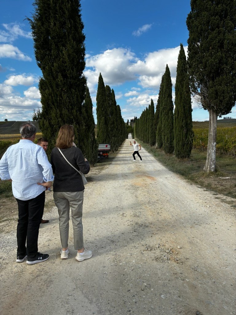 Vår guide berättar…De hade också en olivlund som de höll på att skörda från.Efter föreläsningen var det dax för vinprovning. Först tyckte vi det var en bra idé att sitta ute……men det blåste lite väl mycket…Så vi flyttade in i vinkällaren istället.😊Lite plock till.Det här var vinerna vi testade.Alla deras viner.Vacker utsikt även här 👌Tillbaka i Montepulciano gick vi en promenad upp i staden.Stopp för att njuta av utsikten!Gulliga statyer hade de😊Högst upp hittade vi ett hus som såg intressant ut!Med fin trädgård.En arkeologisk utgrävning under golvetOch ett vinprovning med självservering 😁Lite kul, det var vi tvungna att testa!Vi hittade en väldigt liten och söt bil på vägen hem, det måste fotograferas 😊Magnus för referens 😁Tillbaka i lägenheten och njuta av utsikten!Innan middagen gjord på det vi köpte på marknaden ❤️Morgonen efter checkade vi ut och begav oss till Sienna, där vi ska bo en natt. På ett stopp på vägen hittade vi den här söta medcyklisten🤗I Sienna har Johan hittat det mest centrala boendet man kan hitta mitt på Piazza il Campo (höger pin)! Vi fick dock gå en bit med väskorna eftersom centrumet är bilfritt😁Vi fick tillgång till att ställa av väskorna i lägenheten tidigare av den snälla värden och var så klart tvungna att ta en bild på utsikten!… Innan vi gick genom staden för att möta upp en transport som ska ta oss till två vingårdar! På vägen såg vi en sån här berömd staty La Lupa Capitolina.På resan stannade vi i en liten gullig by som vi promenerade runt i en stund.Kusinerna❤️Ett stopp på vägen utanför denna vingård.Den här bilden säger lite om hur det var när Magnus och Johanna var små❤️😂Första vinprovningen på vägen.Vår guide.De hade en story om 9 kvinnor som alla var representerade på varsitt vin och målade av en konstnär.De var goda viner men kanske inte i relation till priset… enligt Johan och Johanna som är väääldigt mycket mer professionella än vi🤓🤓Fina flaskor i alla fall!Stopp i en annan liten by.Påväg till nästa ställe stannade chauffören på ett personligt favoritställe.Jag tror hans familj ägde marken🤔🤔Han berättade att hans familj brukade ta med sig mat dit och åt där ute…… med denna utsikt!Man förstår ju vad mysigt det är!!Utsikten åt andra hållet var en olivlund.Här var de inte skördade än.Nästa vingårdSå fina statyer överallt, jag har nog aldrig fotat så många tidigare 😂Samling för guidningVår guide, en jättegullig dam!