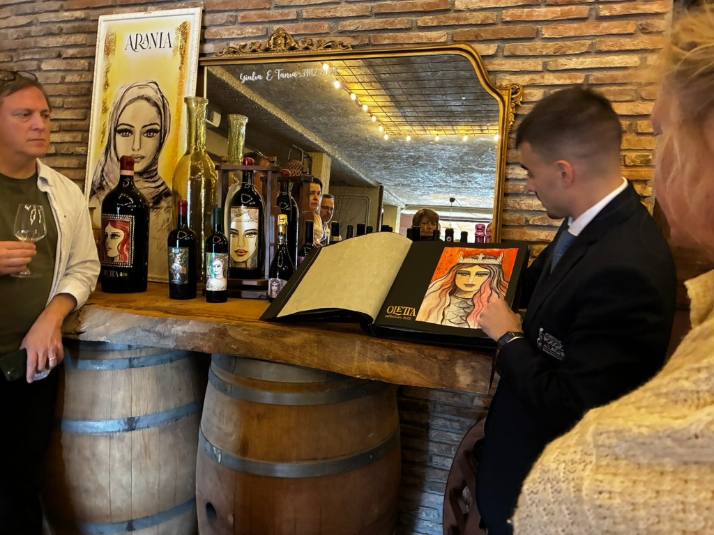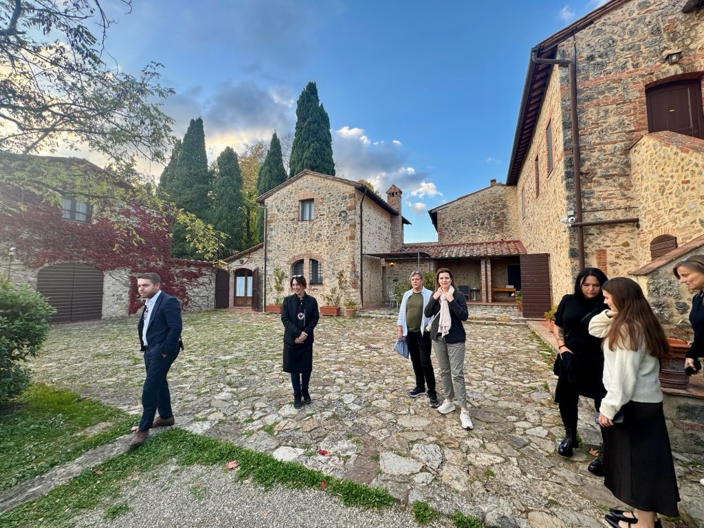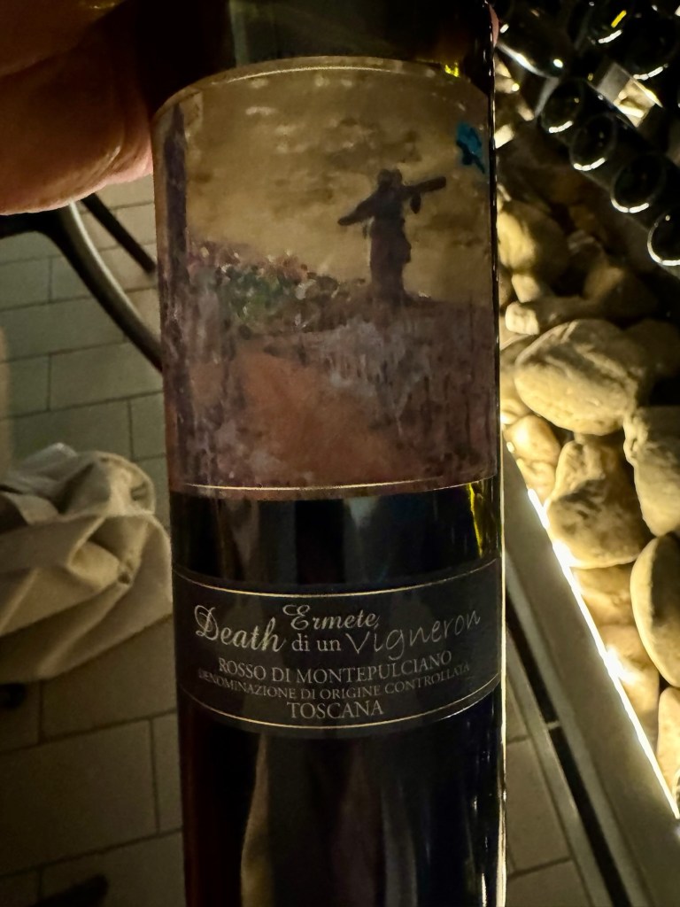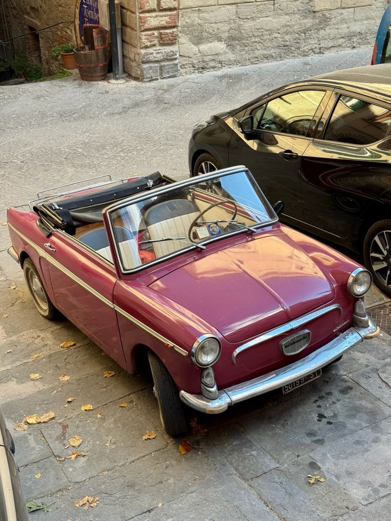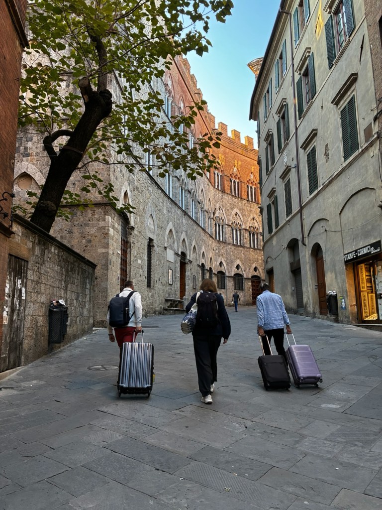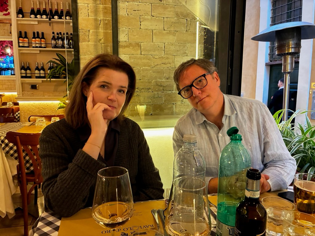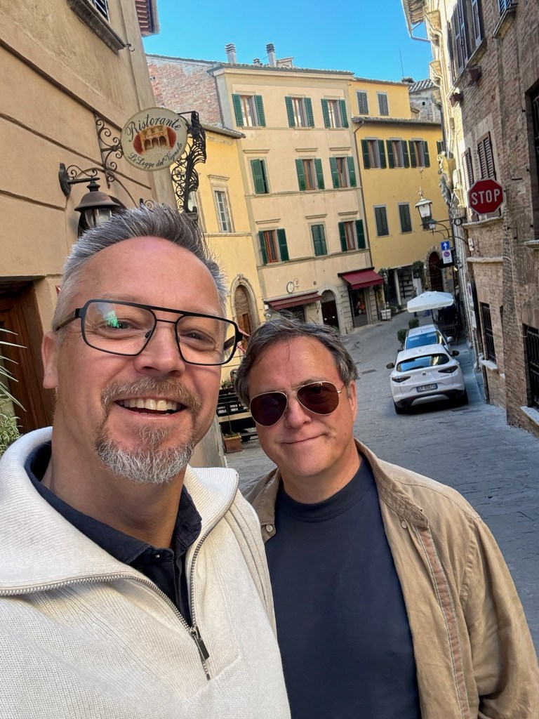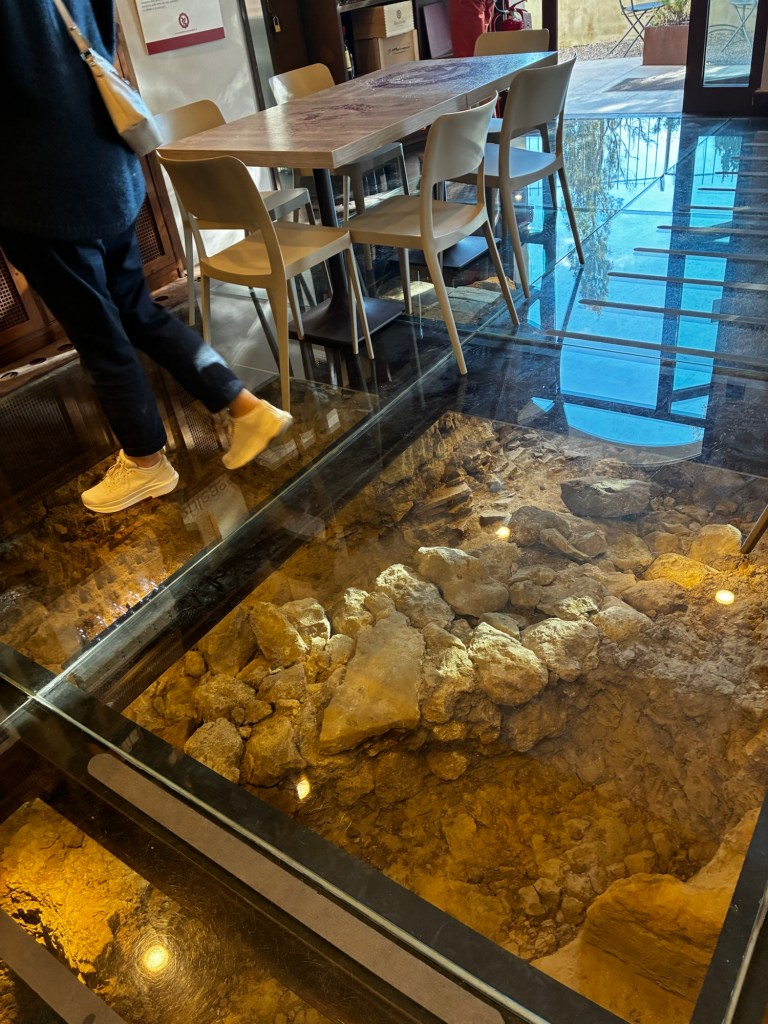 Vår guide berättar…De hade också en olivlund som de höll på att skörda från.Efter föreläsningen var det dax för vinprovning. Först tyckte vi det var en bra idé att sitta ute……men det blåste lite väl mycket…Så vi flyttade in i vinkällaren istället.😊Lite plock till.Det här var vinerna vi testade.Alla deras viner.Vacker utsikt även här 👌Tillbaka i Montepulciano gick vi en promenad upp i staden.Stopp för att njuta av utsikten!Gulliga statyer hade de😊Högst upp hittade vi ett hus som såg intressant ut!Med fin trädgård.En arkeologisk utgrävning under golvetOch ett vinprovning med självservering 😁Lite kul, det var vi tvungna att testa!Vi hittade en väldigt liten och söt bil på vägen hem, det måste fotograferas 😊Magnus för referens 😁Tillbaka i lägenheten och njuta av utsikten!Innan middagen gjord på det vi köpte på marknaden ❤️Morgonen efter checkade vi ut och begav oss till Sienna, där vi ska bo en natt. På ett stopp på vägen hittade vi den här söta medcyklisten🤗I Sienna har Johan hittat det mest centrala boendet man kan hitta mitt på Piazza il Campo (höger pin)! Vi fick dock gå en bit med väskorna eftersom centrumet är bilfritt😁Vi fick tillgång till att ställa av väskorna i lägenheten tidigare av den snälla värden och var så klart tvungna att ta en bild på utsikten!… Innan vi gick genom staden för att möta upp en transport som ska ta oss till två vingårdar! På vägen såg vi en sån här berömd staty La Lupa Capitolina.På resan stannade vi i en liten gullig by som vi promenerade runt i en stund.Kusinerna❤️Ett stopp på vägen utanför denna vingård.Den här bilden säger lite om hur det var när Magnus och Johanna var små❤️😂Första vinprovningen på vägen.Vår guide.De hade en story om 9 kvinnor som alla var representerade på varsitt vin och målade av en konstnär.De var goda viner men kanske inte i relation till priset… enligt Johan och Johanna som är väääldigt mycket mer professionella än vi🤓🤓Fina flaskor i alla fall!Stopp i en annan liten by.Påväg till nästa ställe stannade chauffören på ett personligt favoritställe.Jag tror hans familj ägde marken🤔🤔Han berättade att hans familj brukade ta med sig mat dit och åt där ute…… med denna utsikt!Man förstår ju vad mysigt det är!!Utsikten åt andra hållet var en olivlund.Här var de inte skördade än.Nästa vingårdSå fina statyer överallt, jag har nog aldrig fotat så många tidigare 😂Samling för guidningVår guide, en jättegullig dam!